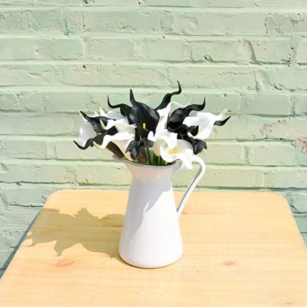 - Size: Full height: 13.5”/35cm; Each flower head diameter:3”/8cm. Including 10pcs black and 10pcs white calla lilies per pack and vase not included.